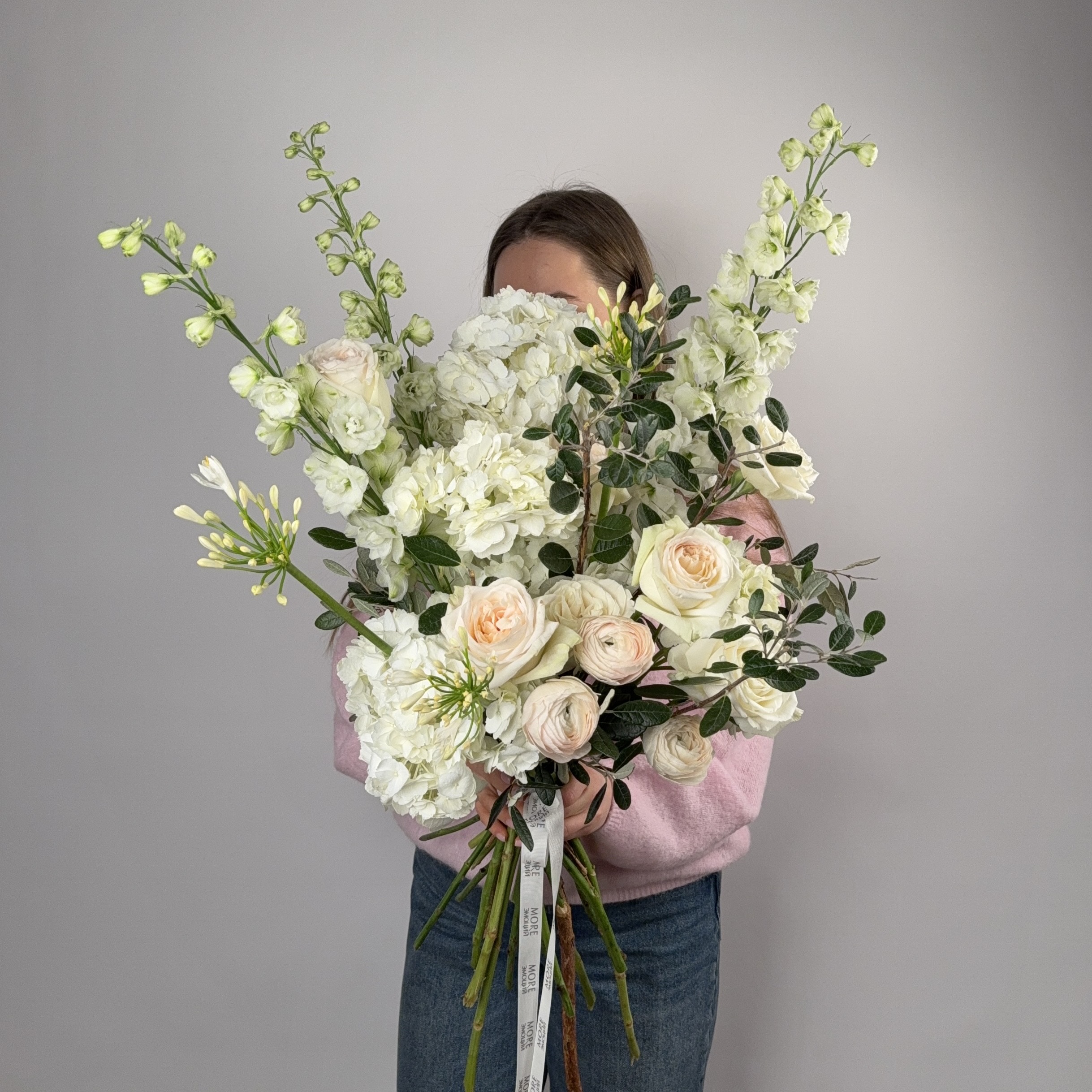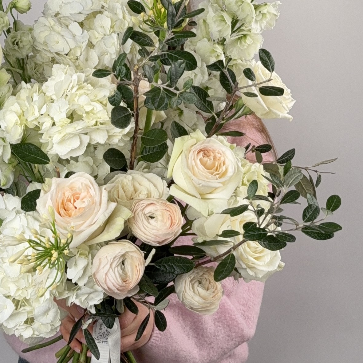 Авторский букет с пионовидной розой, гортензией и ветками фейхоа