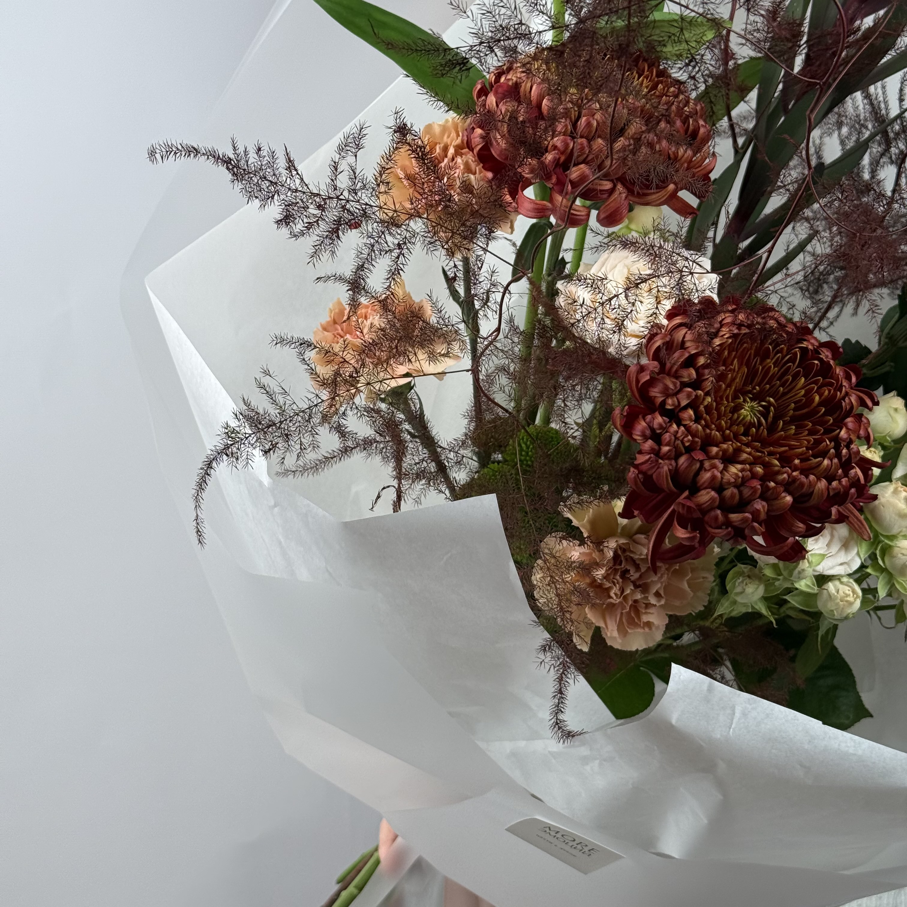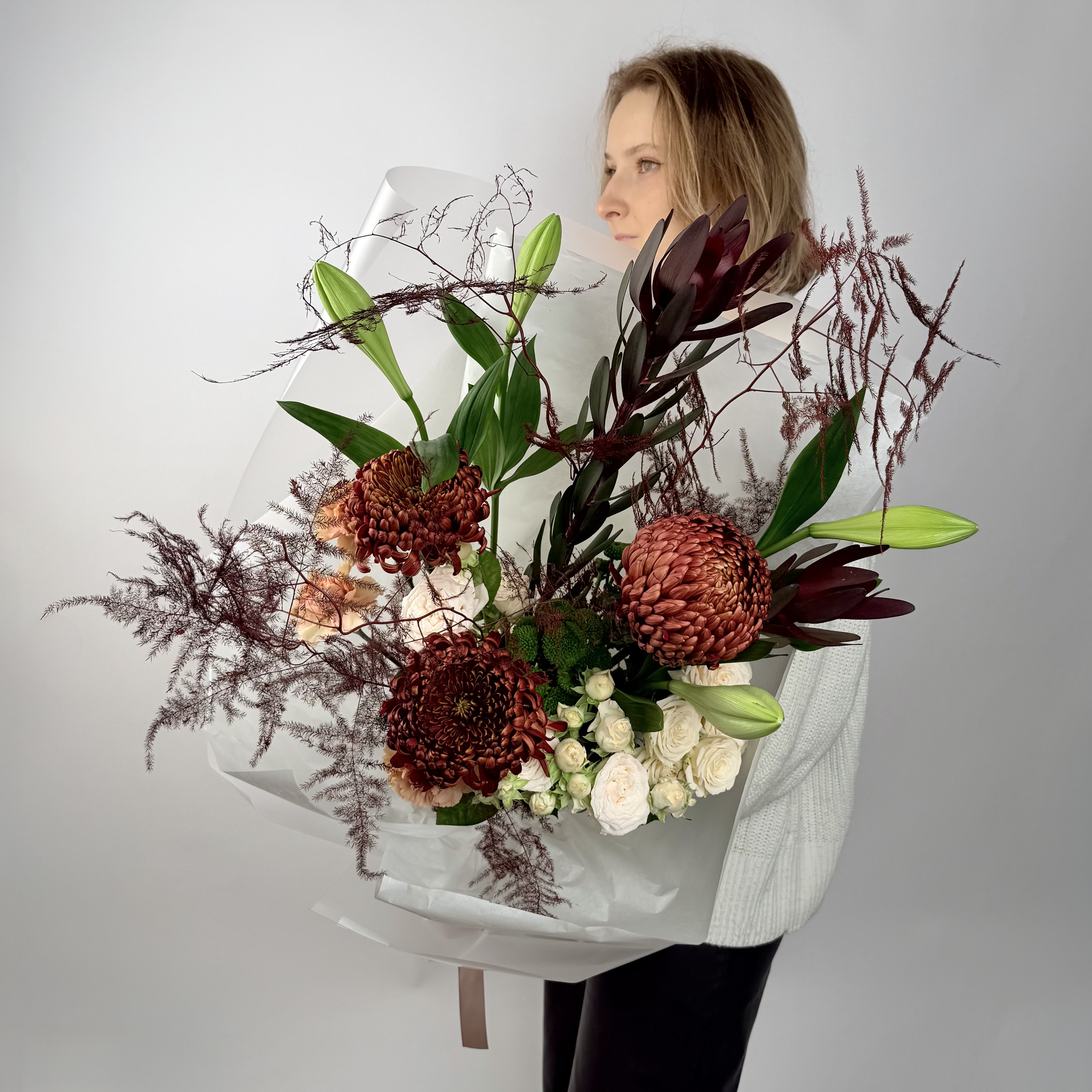 Фактурный, раскидистый букет в кофейно-кремовых оттенках создает ощущение уютного вечера в объятиях пледа с ароматным кофе с корицей.