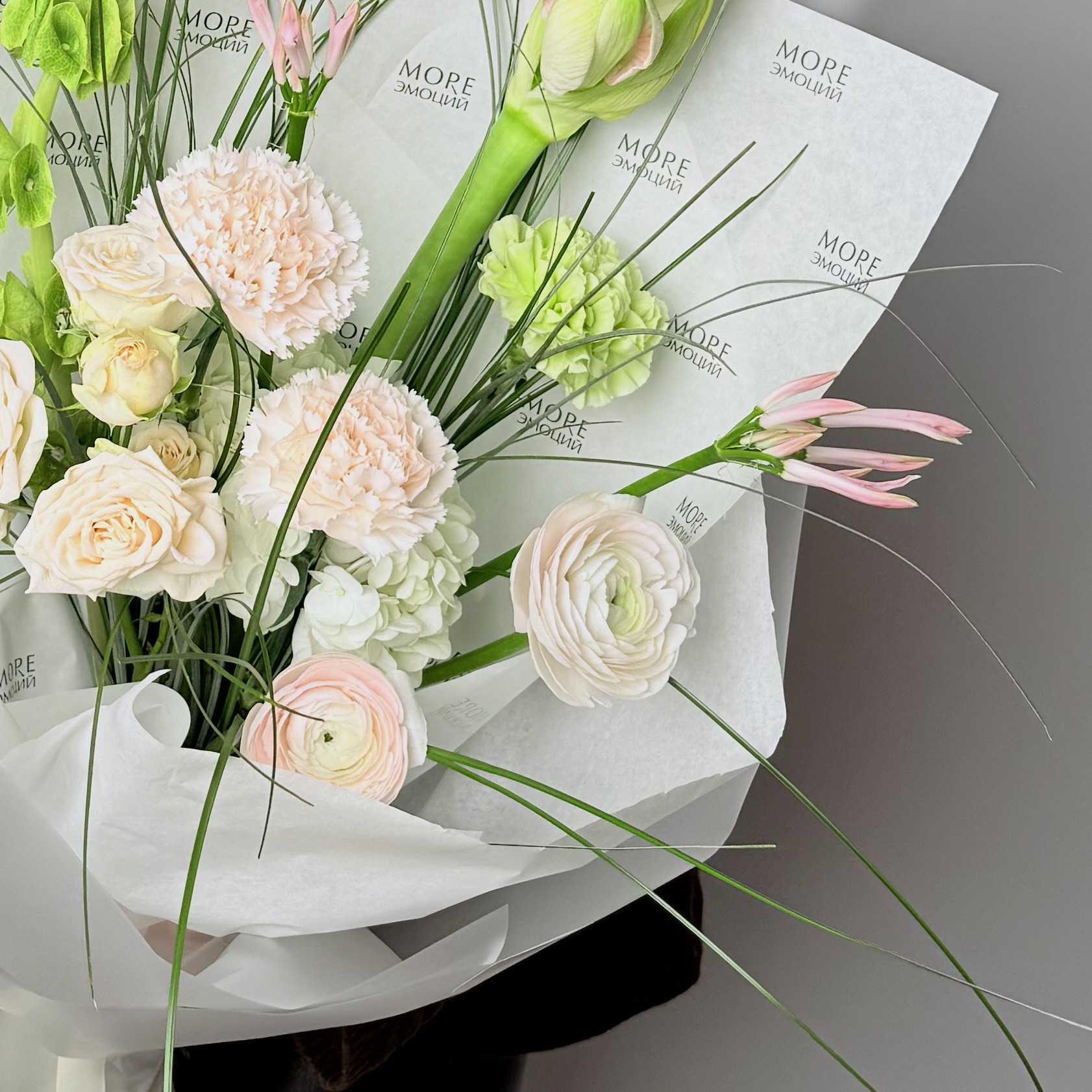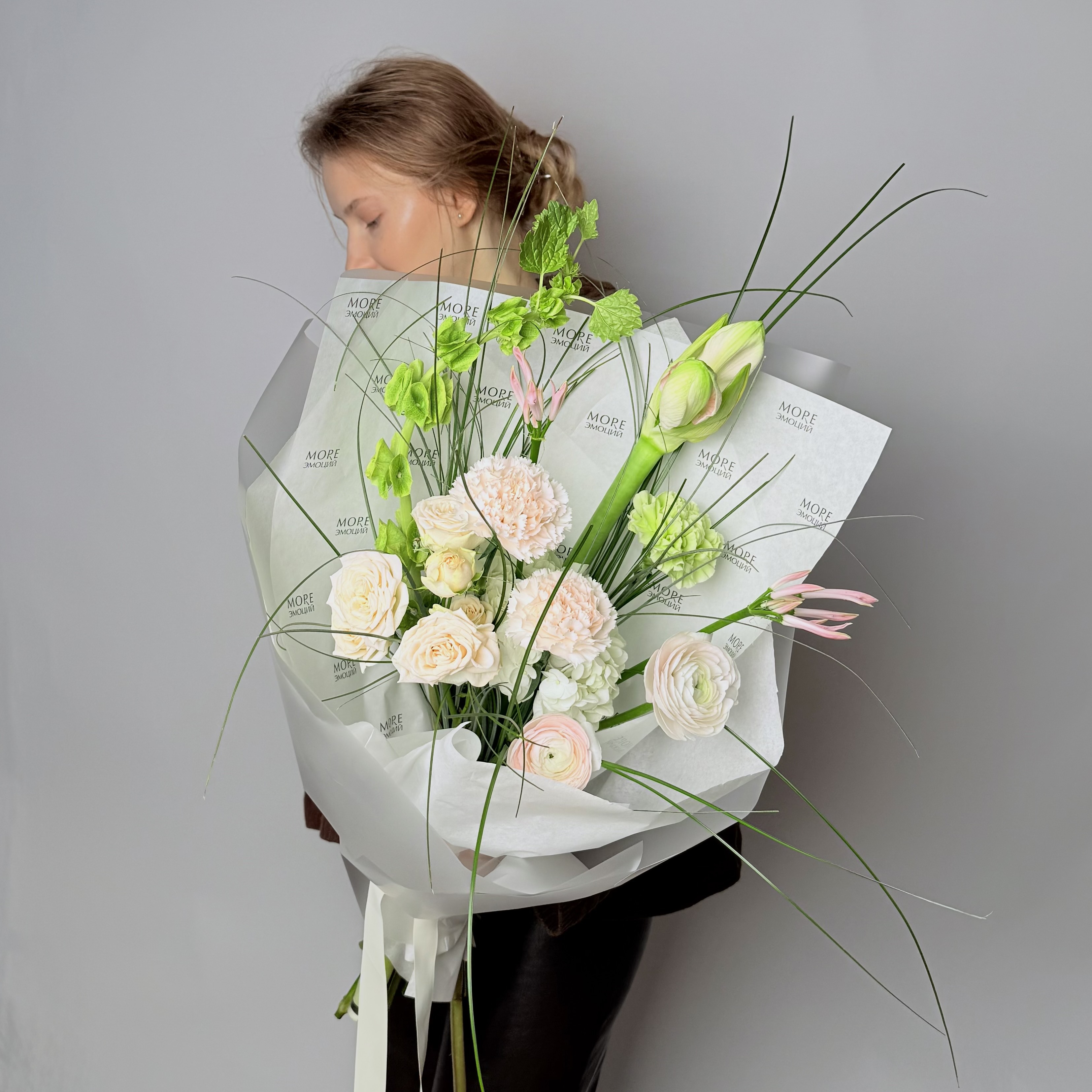 Персиковый амарилис, необычная нерине, роза София и фактурный ранункулюс создают в букете переливы нежности и эстетику гармонии.