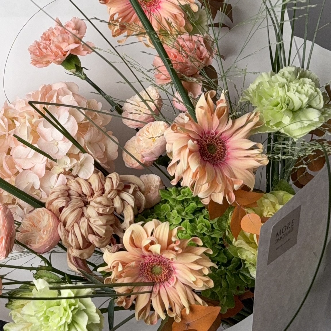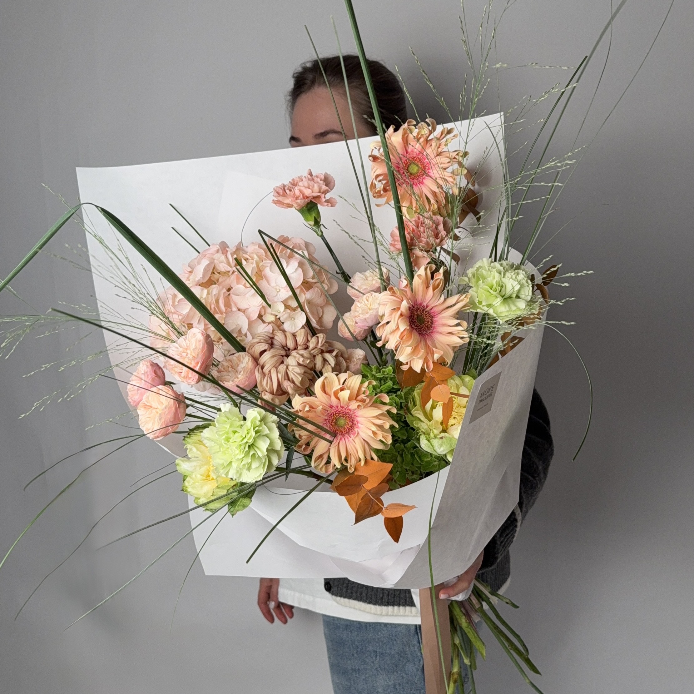 Букет Персиковый шик состоит из фактурной герберы Карбонара, необычной зеленой розы Вегги, пионовидной кустовой розы, фактура и динамика которых передает ощущение тепла и света.