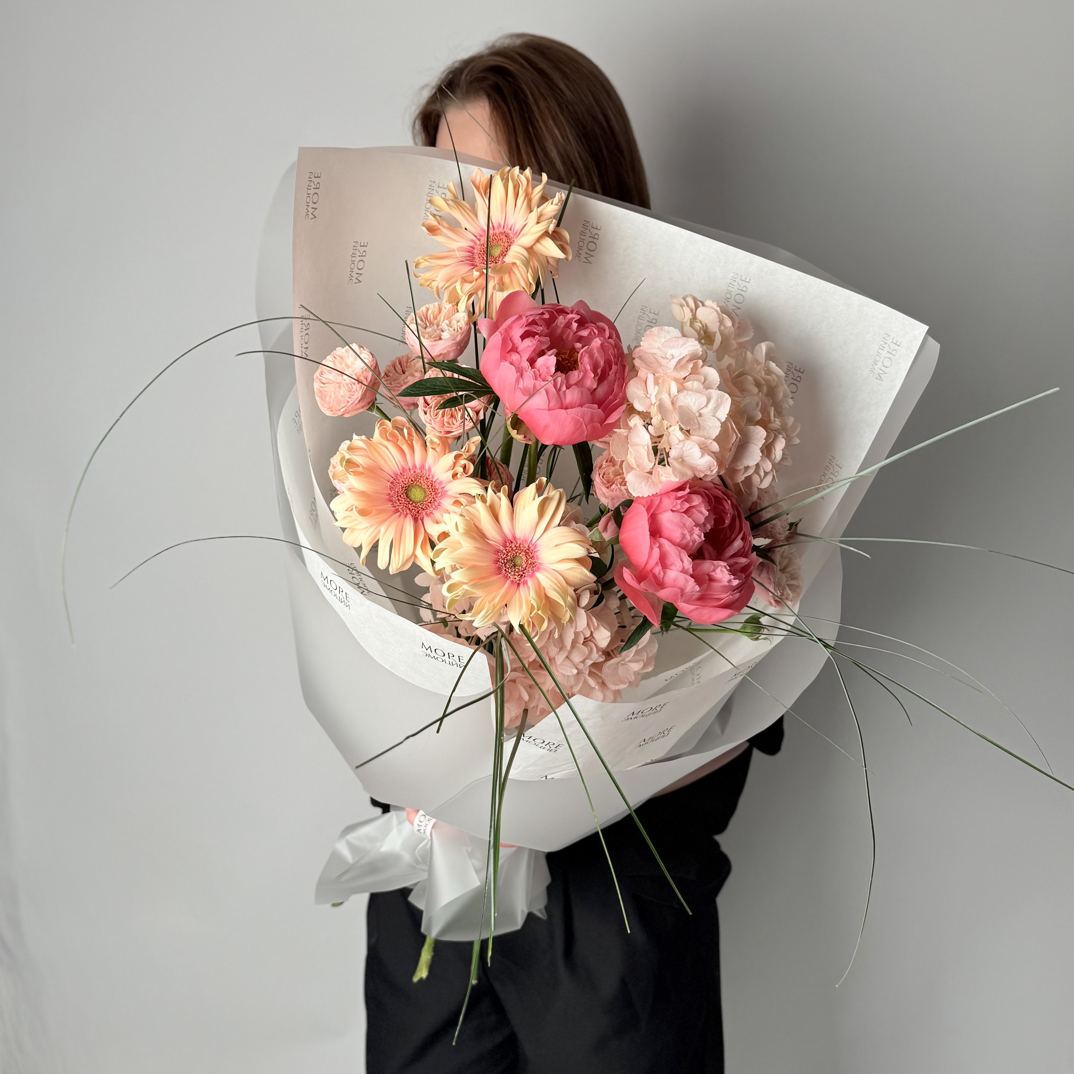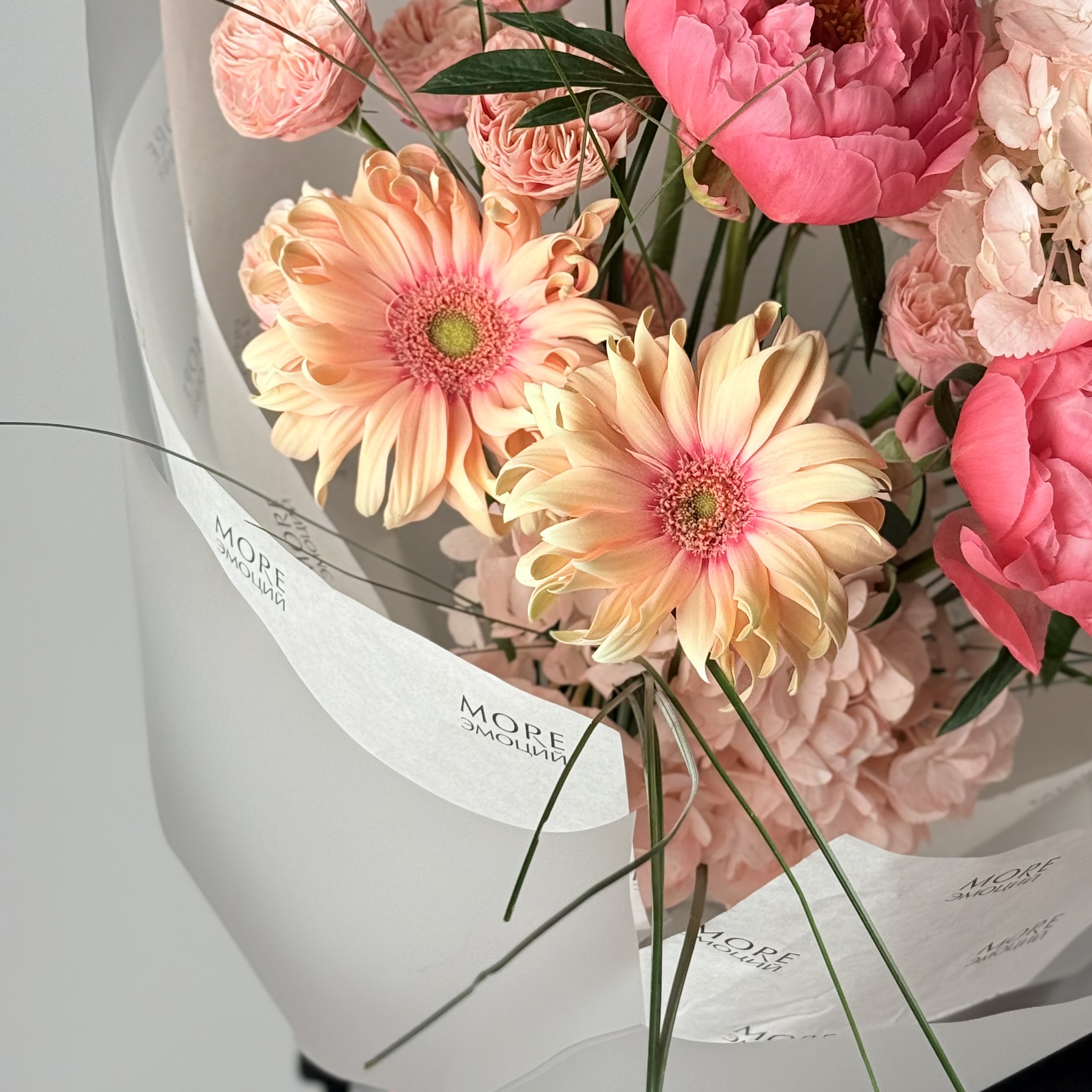 Настоящая драгоценность в холодный сезон - сочный интересный пион Корал, персиковая нежная гербера, воздушная гортензия и пионовидная роза.