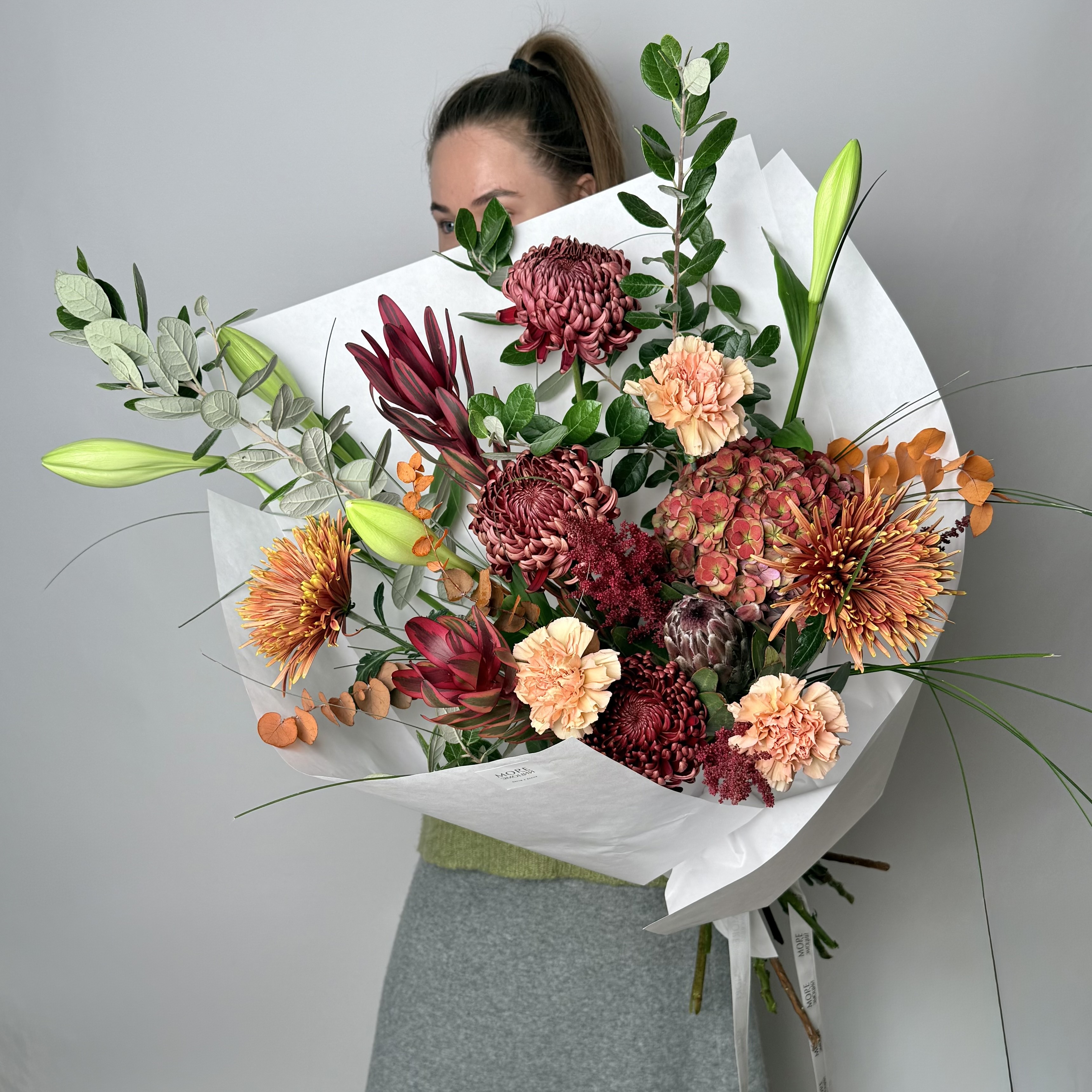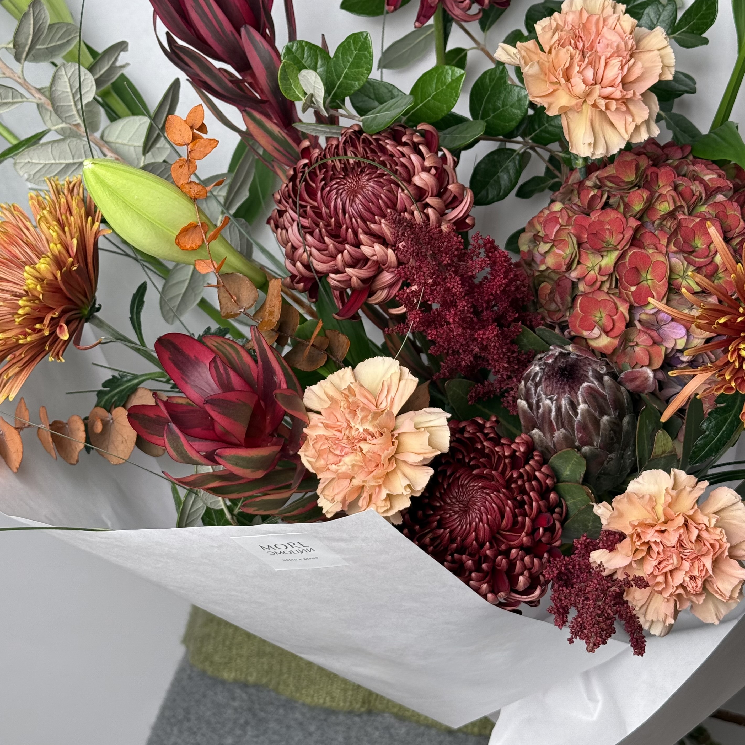 Динамичный насыщенный цветочный подарок, создающий эффект благородного шика и переливов осенних цветов - идеальное решение для ценителей эстетики.