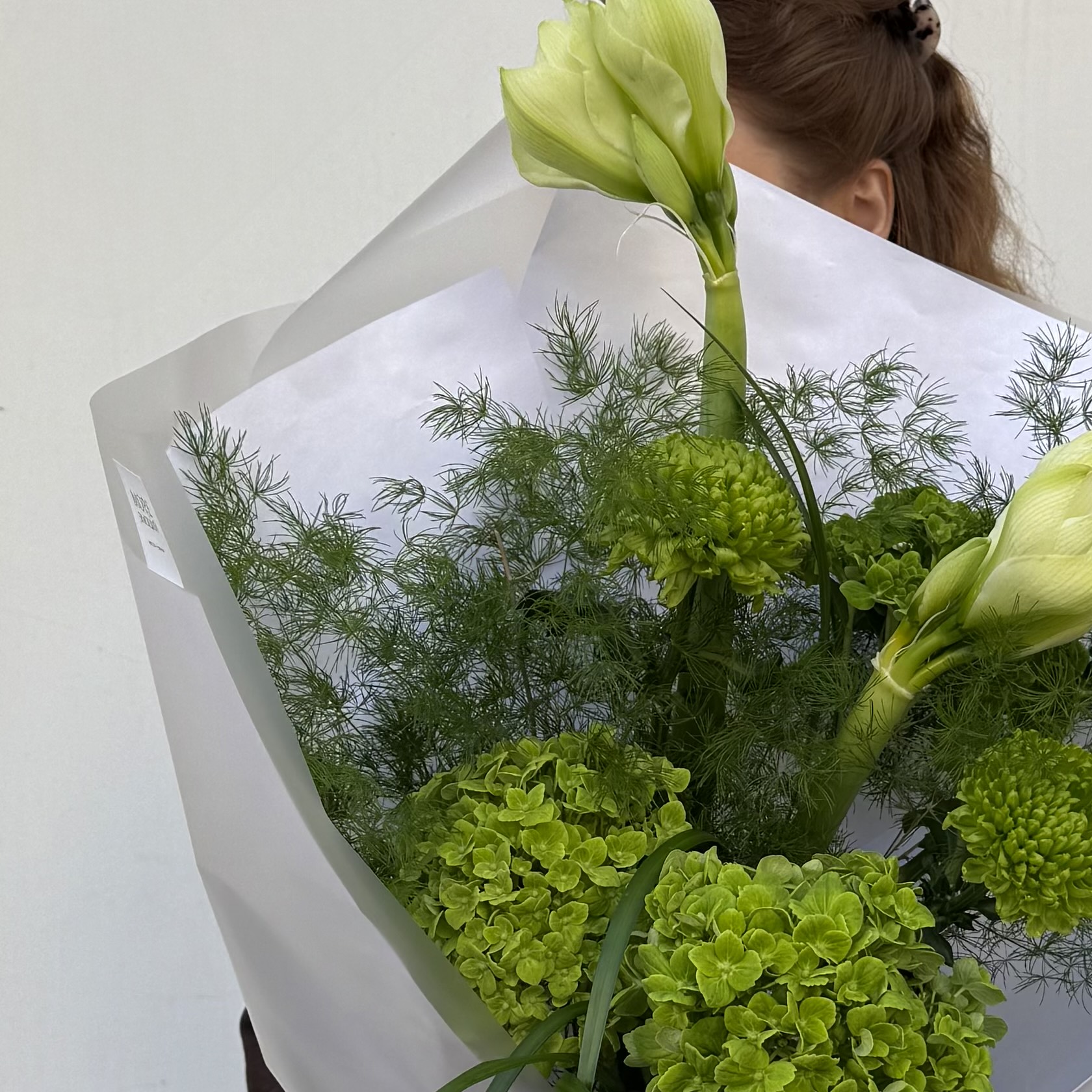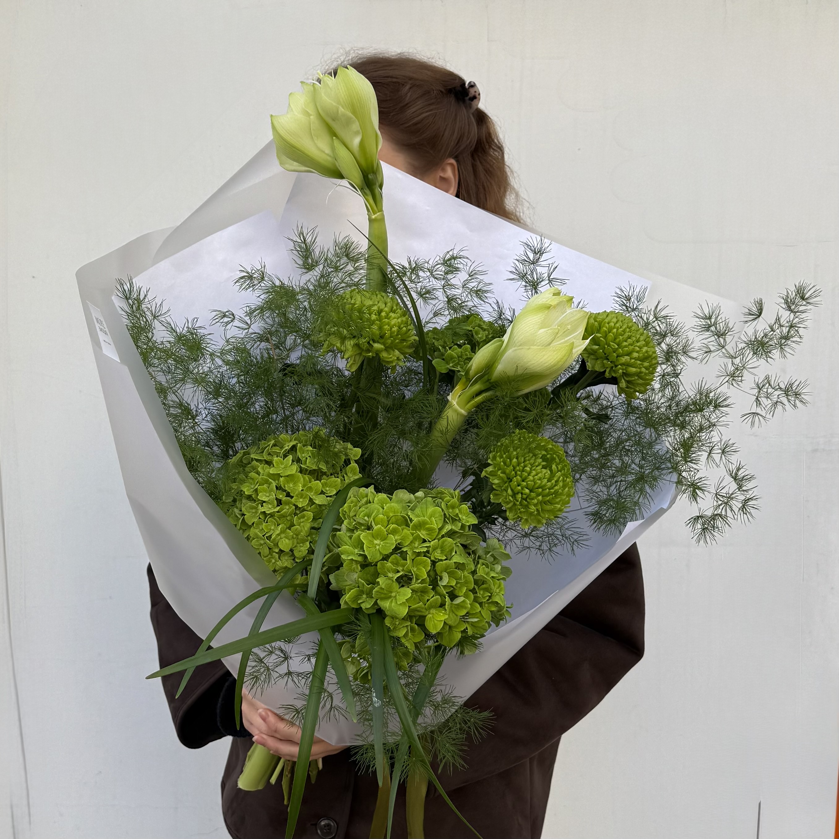 Букет, состоящий из текстурной гортензии, стойкого долгоиграющего амарилиса и воздушной зелени аспарагуса, создаст ощущение свежего бриза и яркости теплого сезона