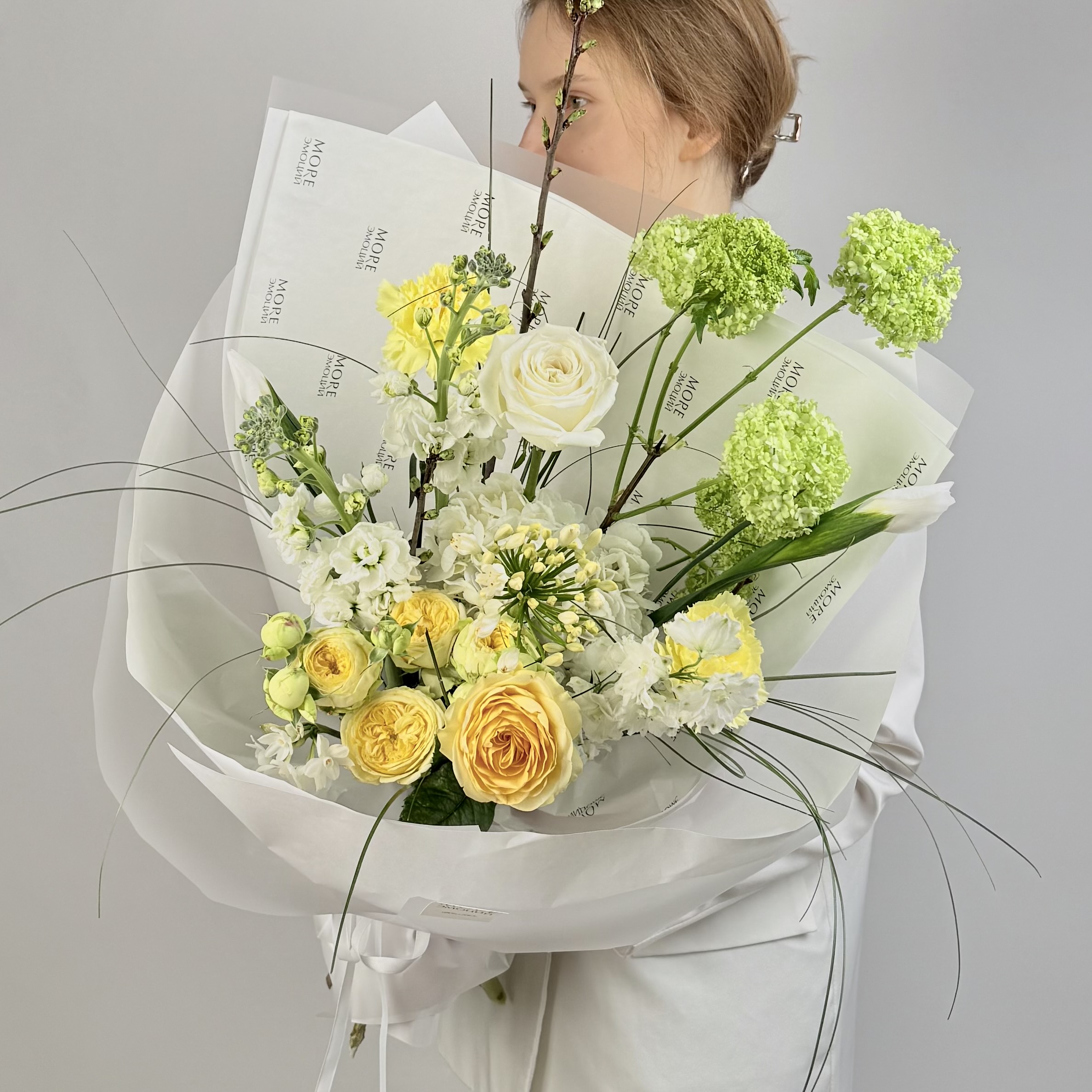 Сборный весенний букет в садовом стиле из воздушного вибурнума, ароматной маттиолы, весеннего нарцисса и ярких солнечных роз сорта Батеркап и Пиони Баблс