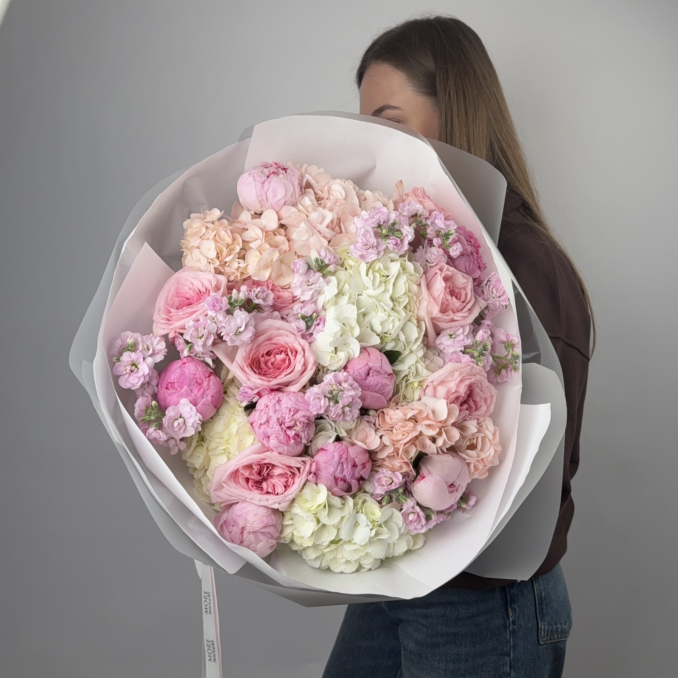 Круглый букет с пионовидной розой , гортензией и ароматной маттиолой.