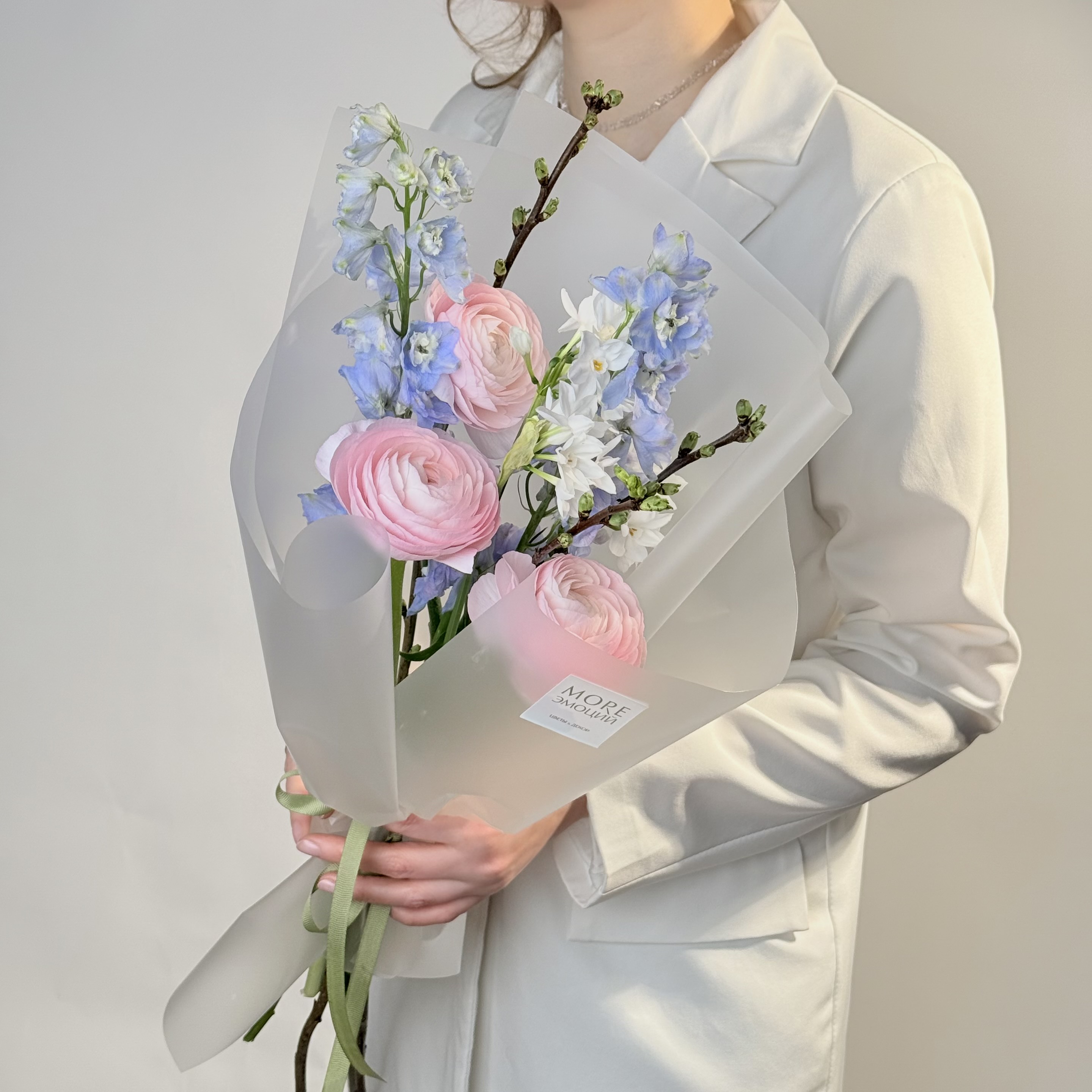 Сборный букет с весенними ветками в нежных оттенках