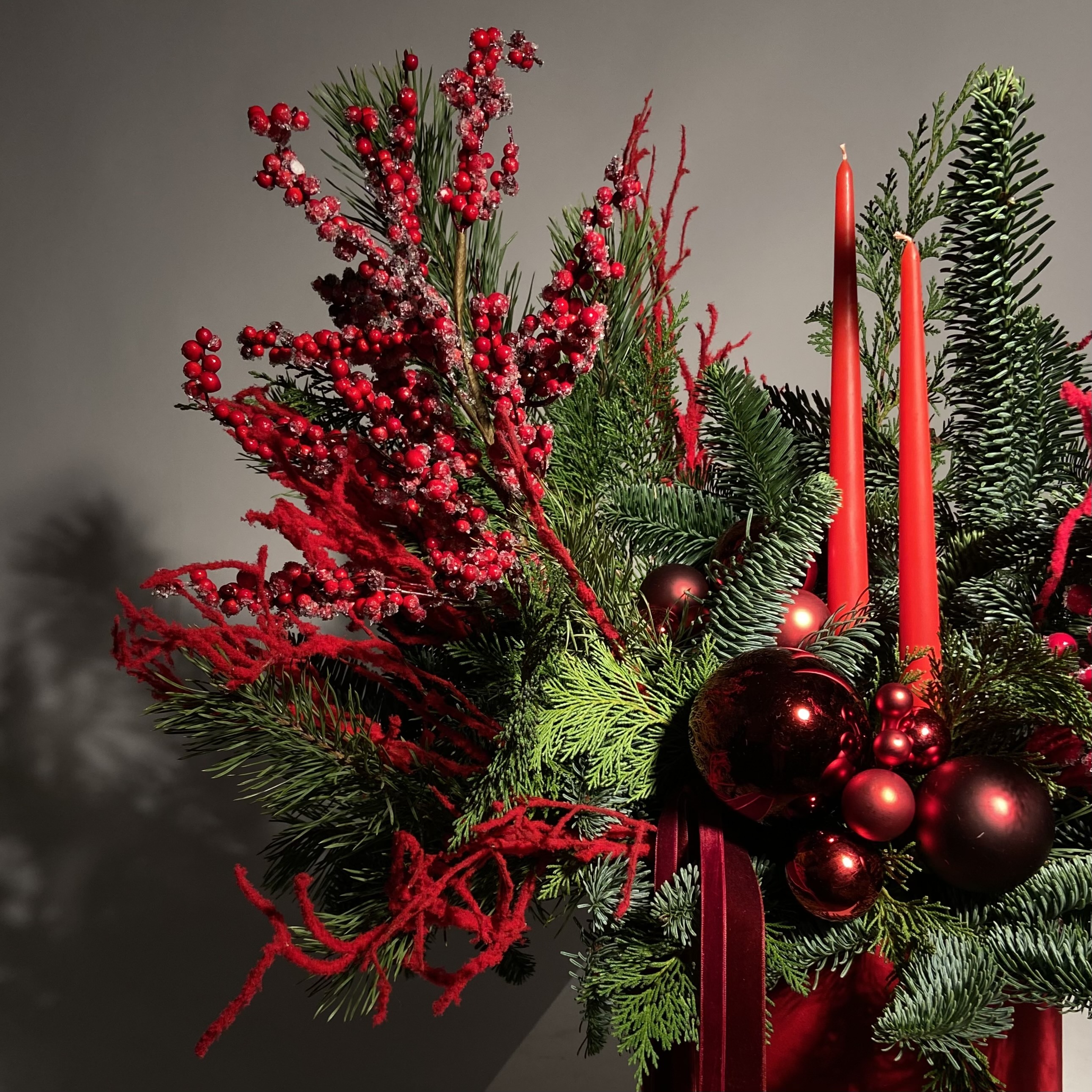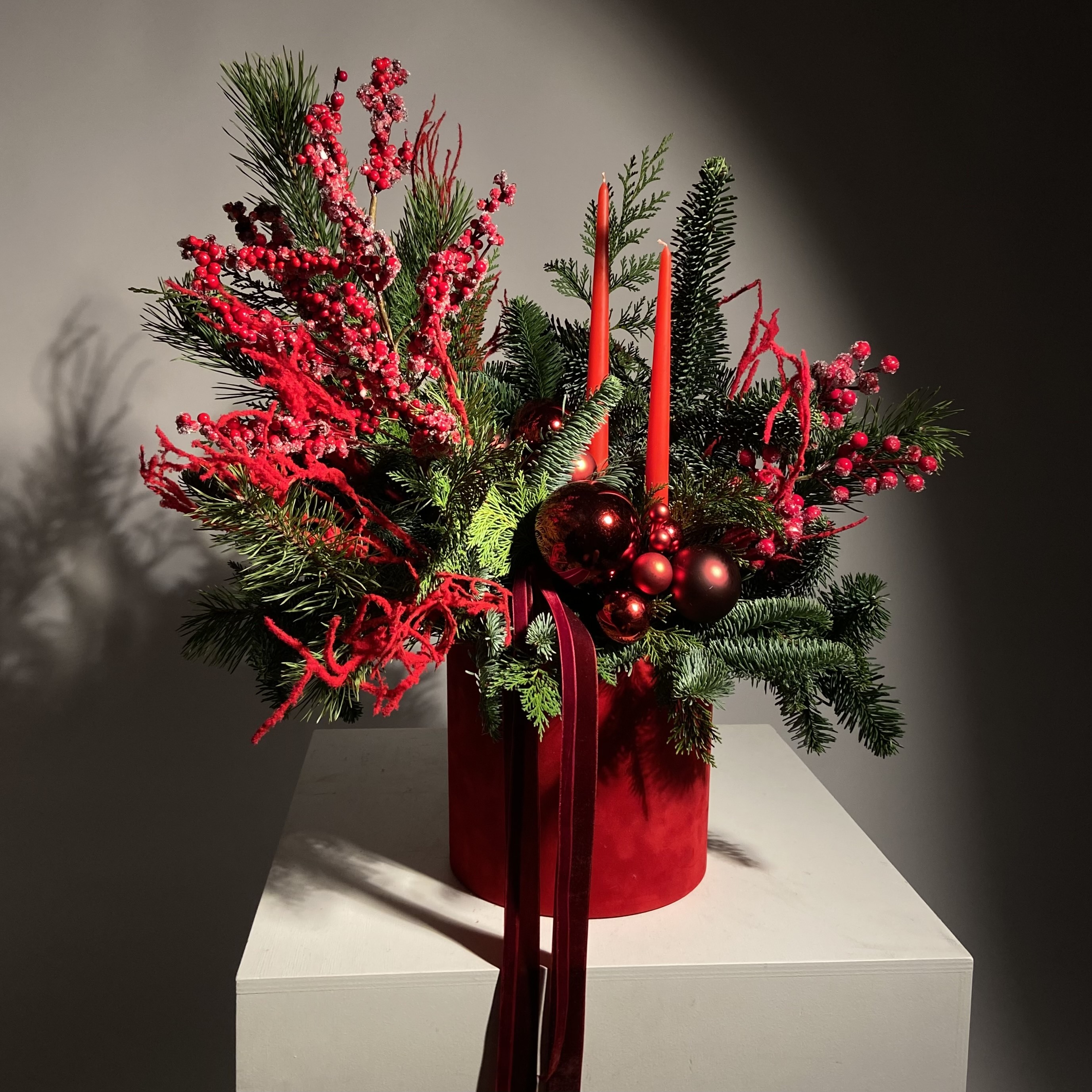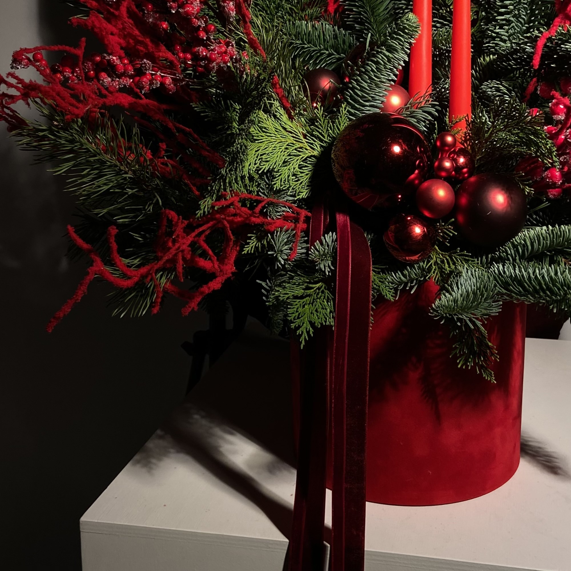 Как и живая хвоя, срезанная дольше всего сохраняется в прохладе. Размещайте композицию подальше от батарей и обогревателей.