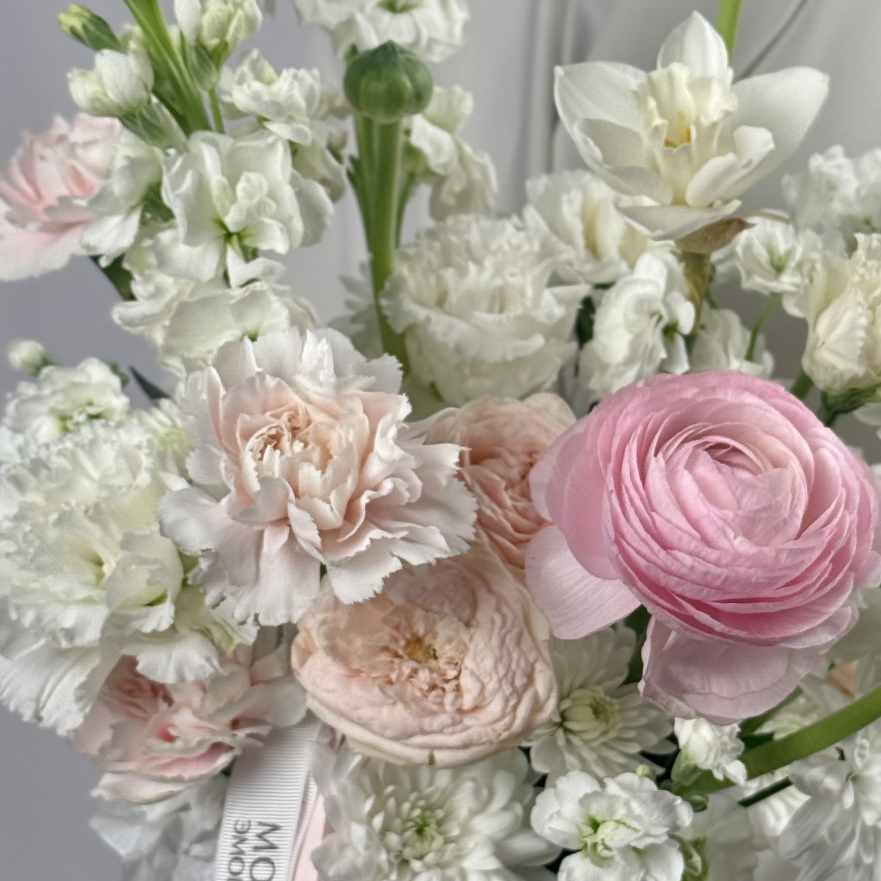 Нежная бело-розовая сборная композиция в шляпной коробке с розовым ранункулюсом, ароматной маттиолой и душистыми нарциссами