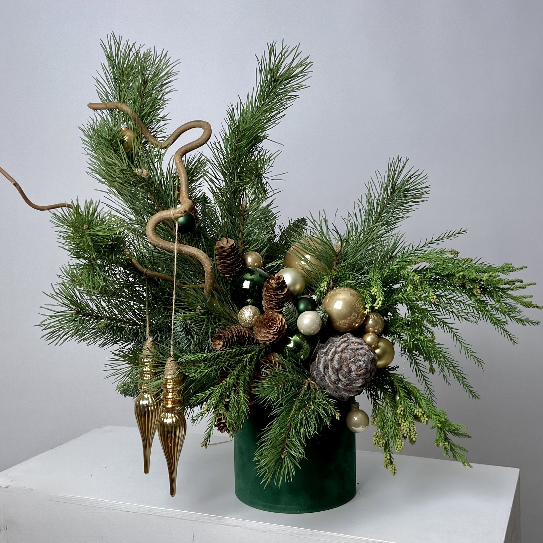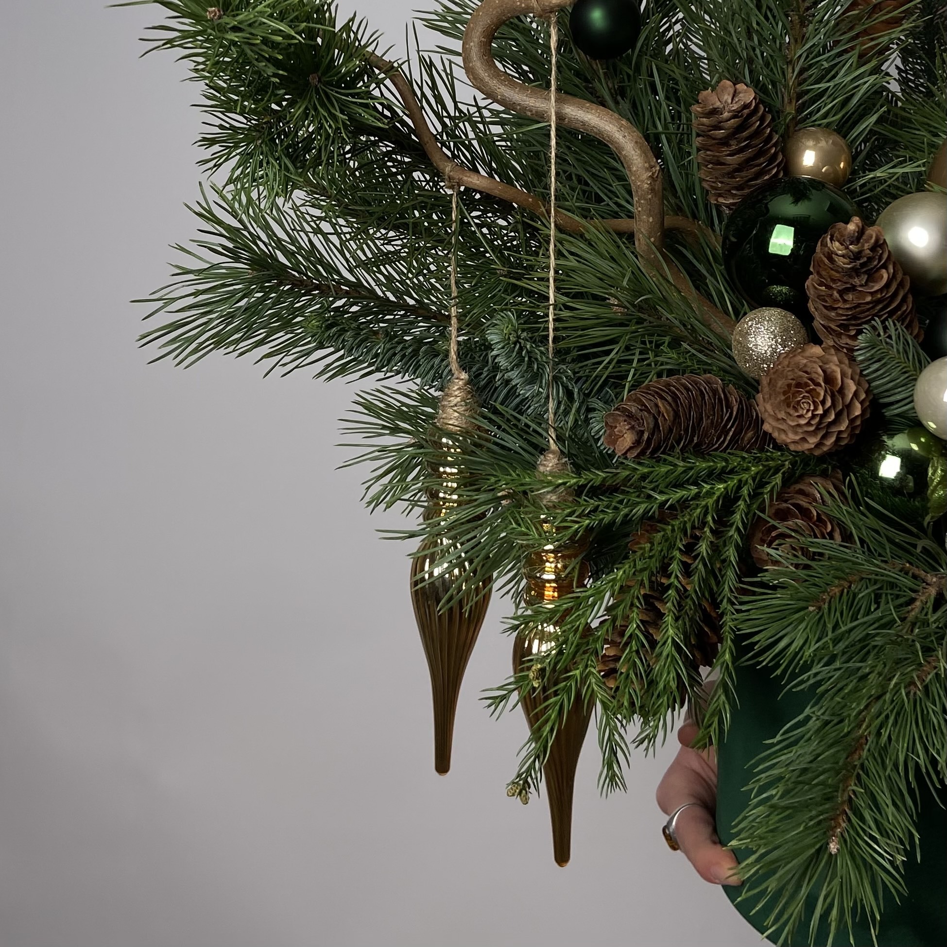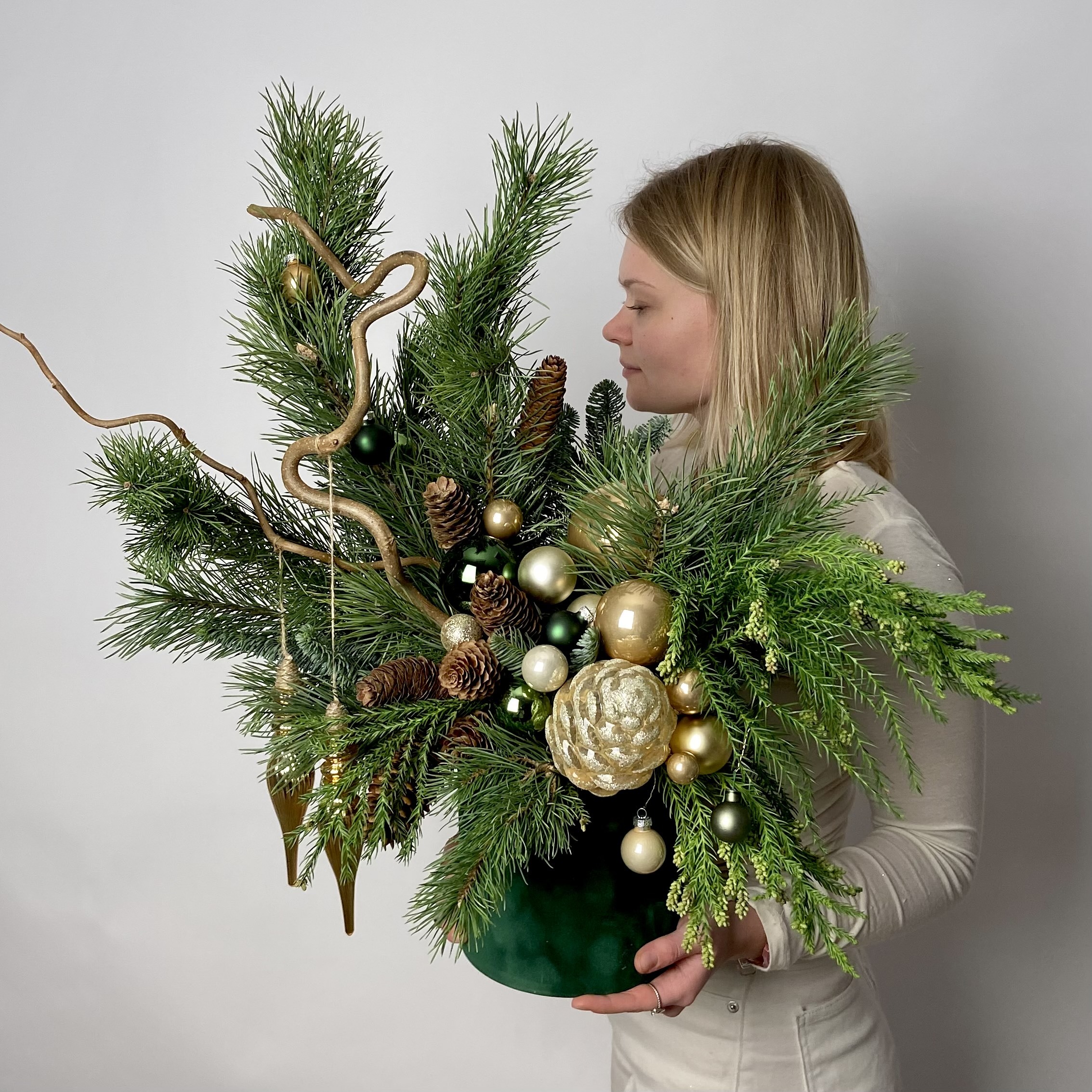 Как и живая хвоя, срезанная дольше всего сохраняется в прохладе. Размещайте композицию подальше от батарей и обогревателей.