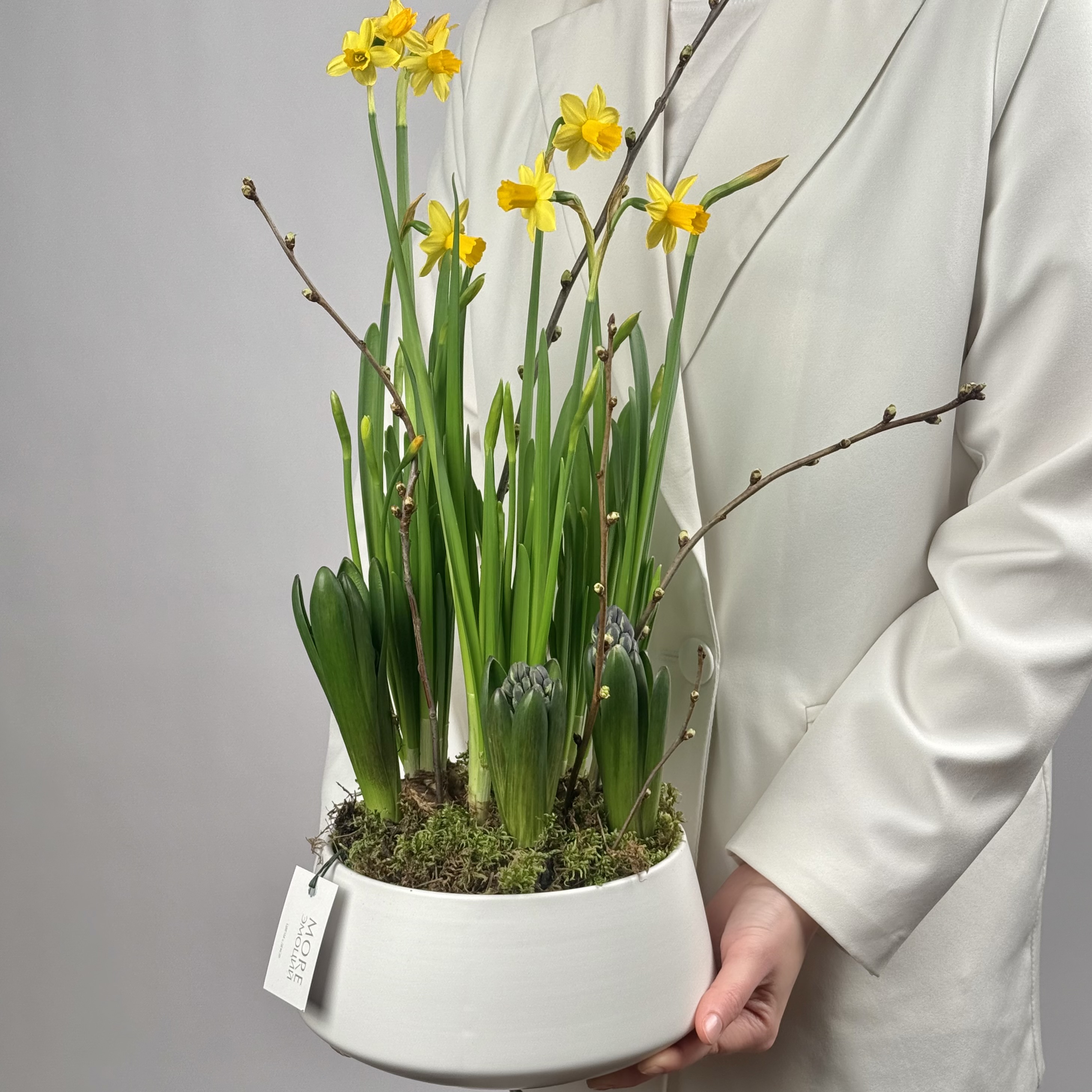 Композиция из весенних луковичных первоцветов (нарциссов и гиацинтов) в керамическом минималитичном кашпо
