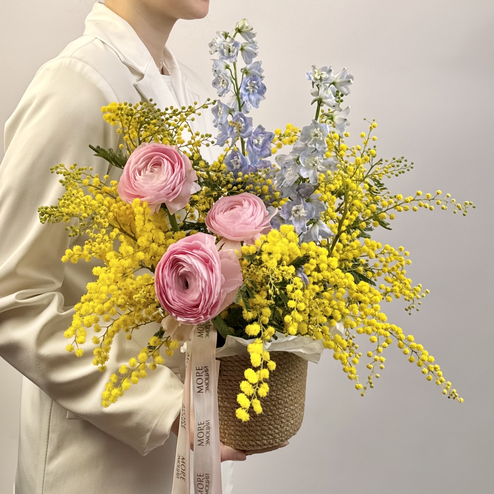 Весенняя ароматная корзина из душистой солнечной мимозы, небесно-голубого дельфиниума и нежного стойкого ранункулюса