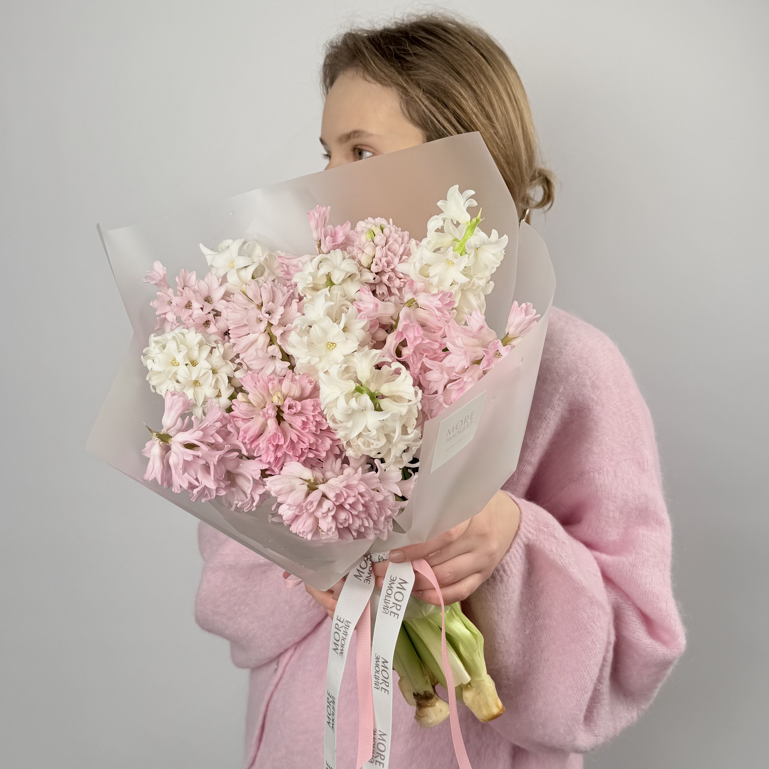 Монобукет из стойких и очень ароматных гиацинтов.