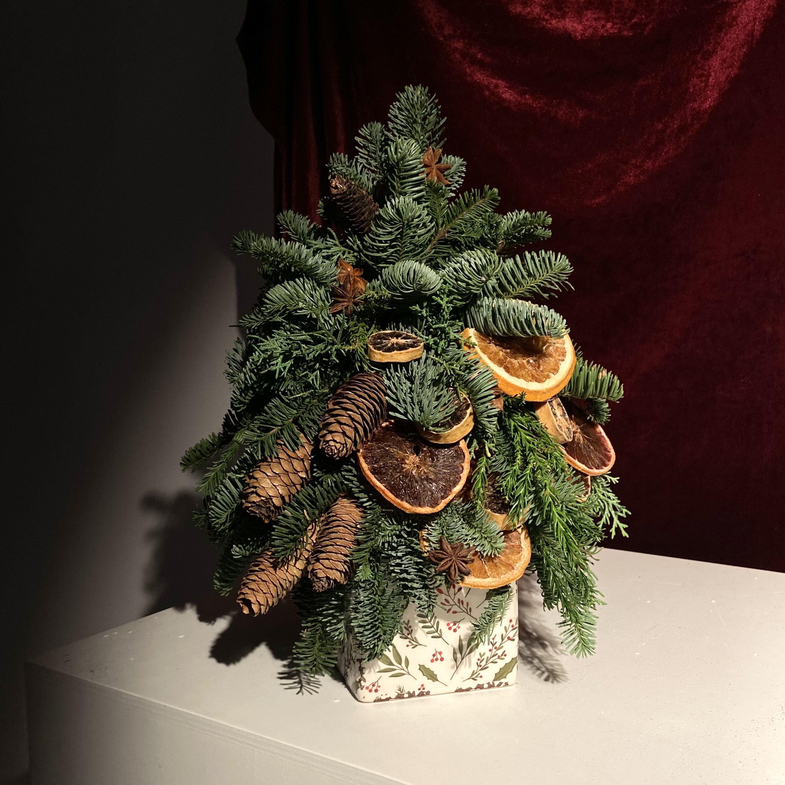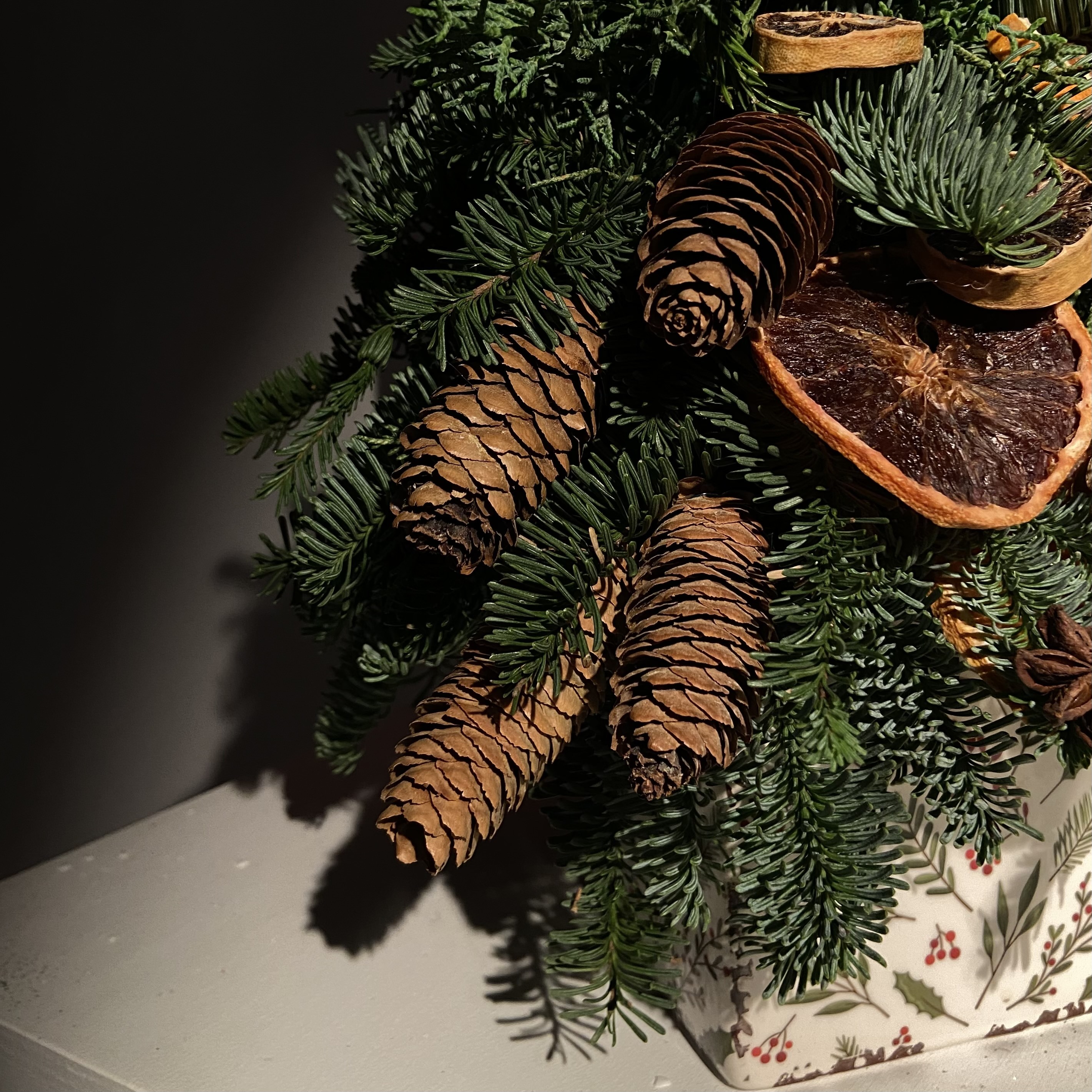 Как и живая хвоя, срезанная дольше всего сохраняется в прохладе. Размещайте композицию подальше от батарей и обогревателей.